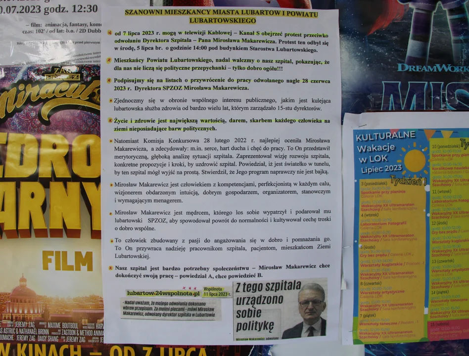 Dyrektor Mirosław Makarewicz ostał odwołany przez Zarząd Powiatu 28 czerwca. Część pracowników szpitala zorganizowała protest w obronie odwołanego dyrektora. Brał w nim udział Jerzy Tracz, były radny miejski, społecznik.