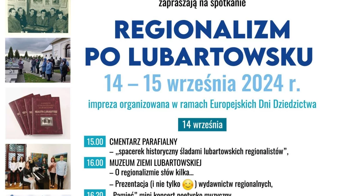 W sobotę 14 września o godz. 15 rozpocznie się spacer historyczny po lubartowskim cmentarzu parafialnym śladami lubartowskich regionalistów. Od godz. 16 w Muzeum Ziemi Lubartowskiej rozpocznie się prezentacja wydawnictw regionalnych, w programie jest koncert poetycko - muzyczny, a o godz. 17 finisaż wystawy Marka Danielkiewicza.