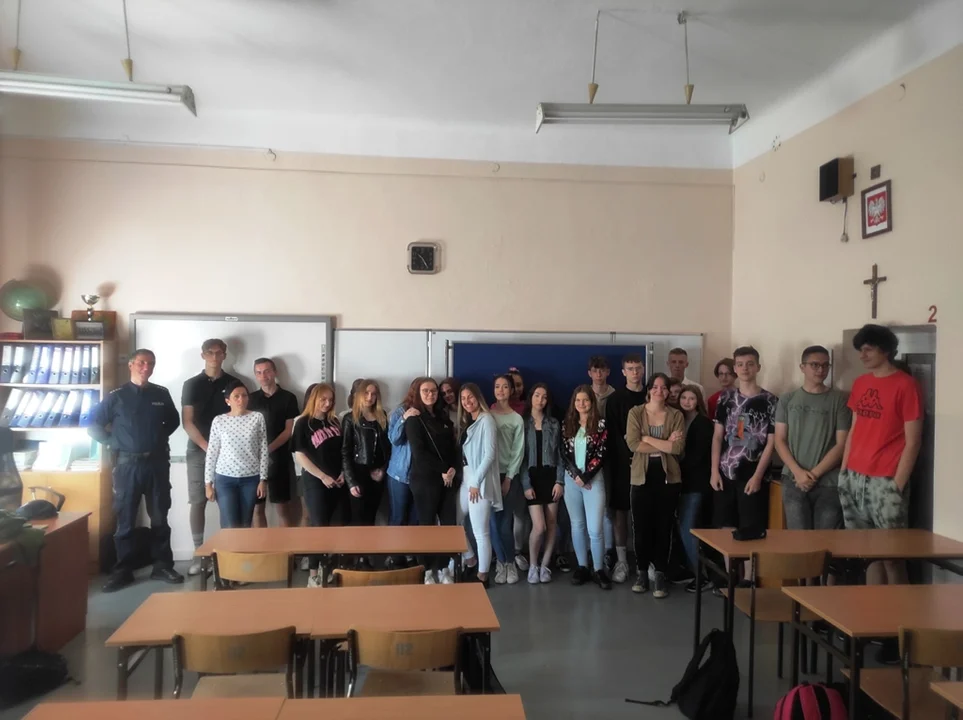 26 maja br. uczniowie klas 2a, 2d i 1a wzięli udział w spotkaniu z funkcjonariuszem Powiatowej Komendy Policji w Lubartowie, aspirantem sztabowym Pawłem Chomiczem, który przeprowadził z młodzieżą zajęcia na temat szkodliwości środków odurzających oraz konsekwencji prawnych wynikających ze stosowania cyberprzemocy.