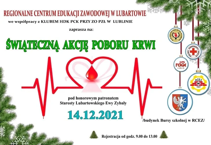 We wtorek 14 grudnia w RCEZ w Lubartowie będzie można oddać krew dla potrzebujących. Chętni mogą się zgłaszać w budynku bursy szkolnej, w godzinach 9 - 13.