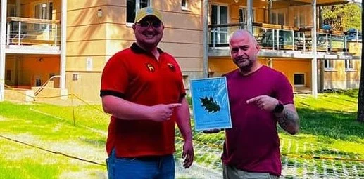 Opis: Adam Kościaańczuk (z lewej) i przedstawiciel Ośrodka Wypoczynkowego Kropelka, zwycięzcy licytacji