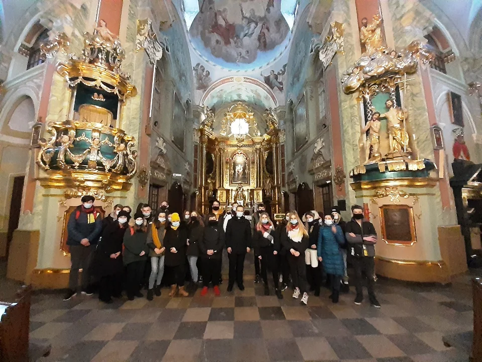 Podczas gdy pierwsza grupa zwiedzała muzeum, druga odwiedziła Bazylikę Św. Anny. Po świątyni młodzież oprowadzał ksiądz Mateusz Golec, który zaciekawił słuchaczy opowieścią o tej pięknej barokowej budowli. Uczniowie poznali historię kościoła, który był wielokrotnie odbudowywany po pożarach oraz podziwiali jego bogaty wystrój zachwycający filarami, witrażami czy licznymi ornamentami, charakterystycznymi dla sztuki baroku.