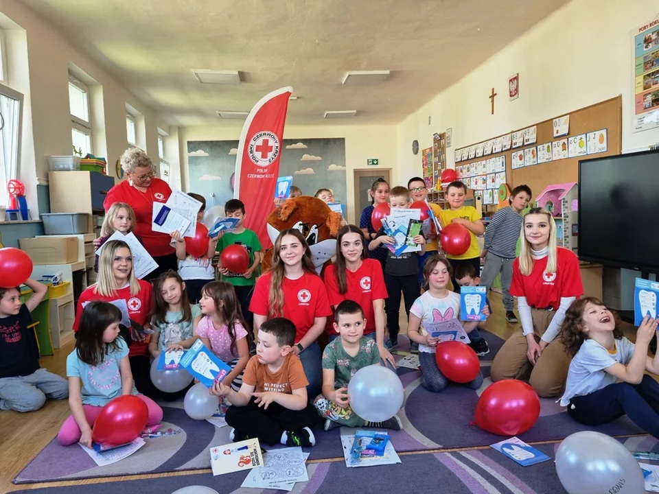 Uczniowie z II Liceum Ogólnokształcącego w ramach programu Polskiego Czerwonego Krzyża "Chrońmy Dziecięce Uśmiechy" odwiedzili Przedszkole "Kolorowy Świat". Celem wizyty było przeprowadzenie zajęć edukacyjnych na temat higieny jamy ustnej dla dzieci w wieku przedszkolnym.