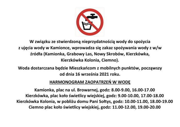 Na terenie gminy Kamionka wprowadzono czasowy zakaz używania do celów spożywczych wody z ujęcia w Kamionce. Obowiązuje on w miejscowoścach: Kamionka, Grabowy Las, Nowy Skrobów, Kierzkówka, Kierzkówka Kolonia, Ciemno.