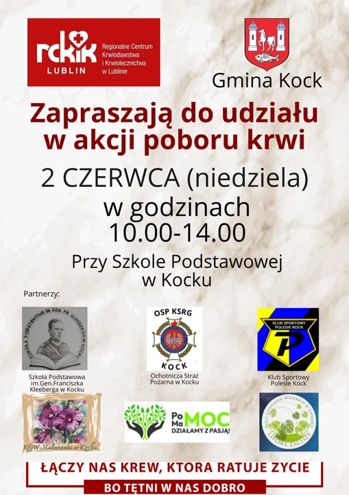 Akcję poboru krwi organizują Regionalne Centrum Krwiodawstwa i Krwiolecznictwa w Lublinie i gmina Kock. Odbędzie się ona 2 czerwca w godzinach 10 -14 przy Szkole Podstawowej w Kocku.