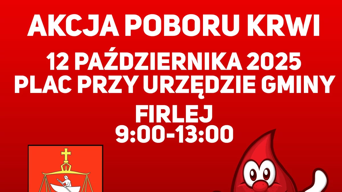 12 października w Firleju będzie można oddawać krew na placu przy Urzędzie Gminy. Akcja krwiodawstwa rozpocznie się o godz. 9 i potrwa do godz. 13. Krew mogą oddawać osoby od 18 do 65 roku życia,ważące co najmniej 50 kg,zdrowe, wypoczęte i po lekkim posiłku.