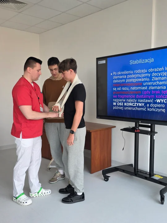 Po wykładzie przyszzła kolej na część praktyczną. Uczniowie uczyli się samodzielnie unieruchamiać uszkodzone kończyny za pomocą różnych technik. Wykorzystując bandaże i temblaki, młodzież ćwiczyła stabilizację rąk i nóg, dbając o precyzję i bezpieczeństwo poszkodowanego. W trakcie ćwiczeń dr Kulesza udzielał cennych wskazówek i korygował ewentualne błędy, dzięki czemu uczniowie mogli doskonalić swoje umiejętności.