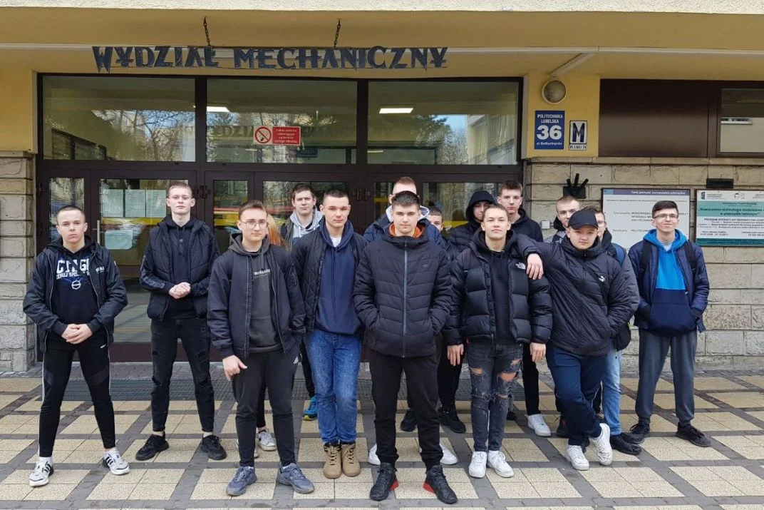 21.03.2023 r. klasa 2 TM pod opieką nauczycieli przedmiotów mechanicznych G. Daniła i A. Rysiowskiego uczestniczyła w zajęciach organizowanych na Politechnice Lubelskiej w ramach projektu „Technika Akademickie jako departamenty promocji nauki w otoczeniu społeczno-biznesowym". Uczniowie podczas wizyty zapoznali się z laboratorium obróbki ubytkowej, gdzie odbyły się zajęcia pokazowe dotyczące obróbki strumieniowo-ściernej, zajęcia w pracowni komputerowej dotyczące projektowania części mechanicznych przy użyciu oprogramowania inżynierskiego NX firmy Siemens oraz zajęcia dotyczące wirtualnych maszyn.