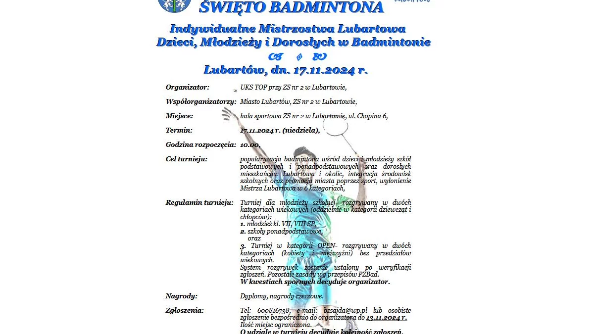 Indywidualne Mistrzostwa w Badmintonie Dzieci, Młodzieży i Dorosłych odbędą się 17 listopada. Turniej bedzie rozgrywany w dwóch kategoriach wiekowych, oddzielnie dla dziewcząt i chłopców: klasy VII i VIII oraz szkoły ponadpodstawowe.