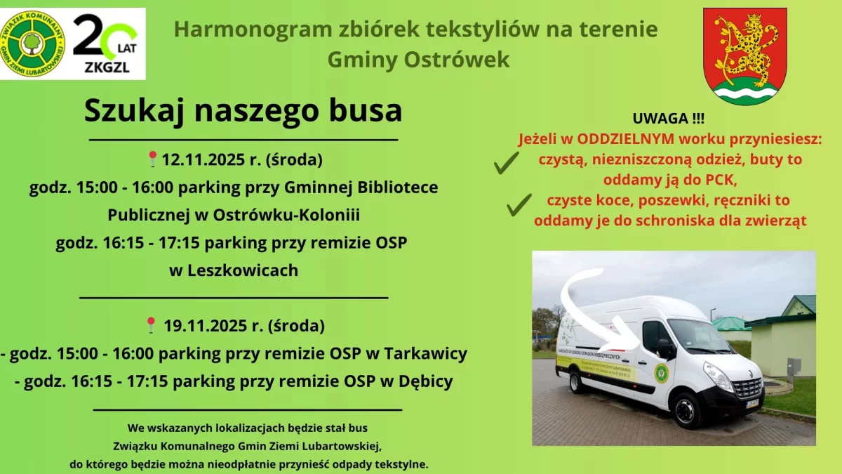 Związek Komunalny Gmin Ziemi Lubartowskiej organizuje zbiórki odpadów tekstylnych wgminach członkowskich. Odwiedza je bus, który odbiera odpady. W listopadzie przyjedzie do gminy Ostrówek.