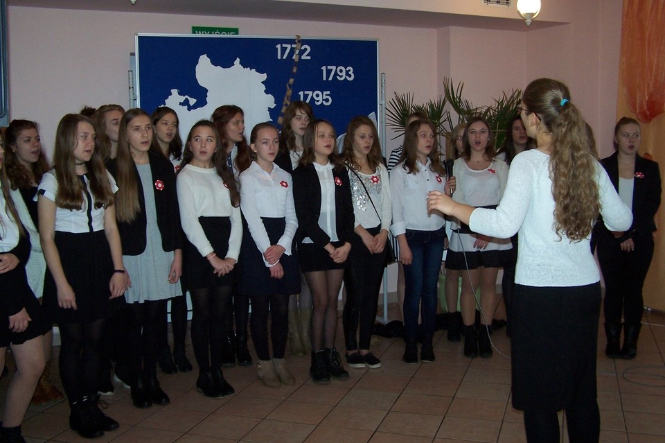 Dopełnieniem ważnego przesłania płynącego ze sceny, stały się pieśni patriotyczne w wykonaniu chóru szkolnego oraz solistów. Można było wysłuchać pięknych interpretacji znanych utworów muzycznych wzmacniających ducha bojowego Polaków w trudnych momentach historycznych: ,,Mazurek Dąbrowskiego”, ,,Kwiaty polskie”, ,,Rota”, ,,Rozkwitały pąki białych róż”, ,,Pierwsza brygada”, ,,Piechota”, ,,Nadzieja”.