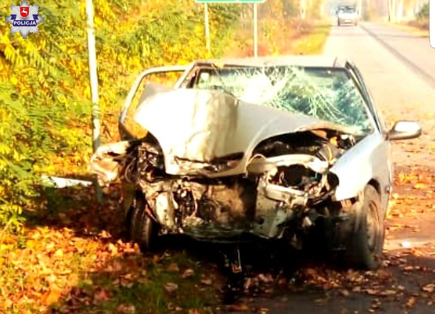 Kierująca fiatem seicento na skrzyżowaniu nie ustąpiła pierwszeństwa przejazdu jadącemu w kierunku Lubartowa citroenowi. Tym autem kierował 36-letni mieszkaniec powiatu lubartowskiego. Mężczyzna zaczął nagle hamować, stracił panowanie nad samochodem, zjechał na pobocze i uderzył w drzewo. Wskutek wypadku do szpitala przewieziony został 44-letni pasażer citroena.