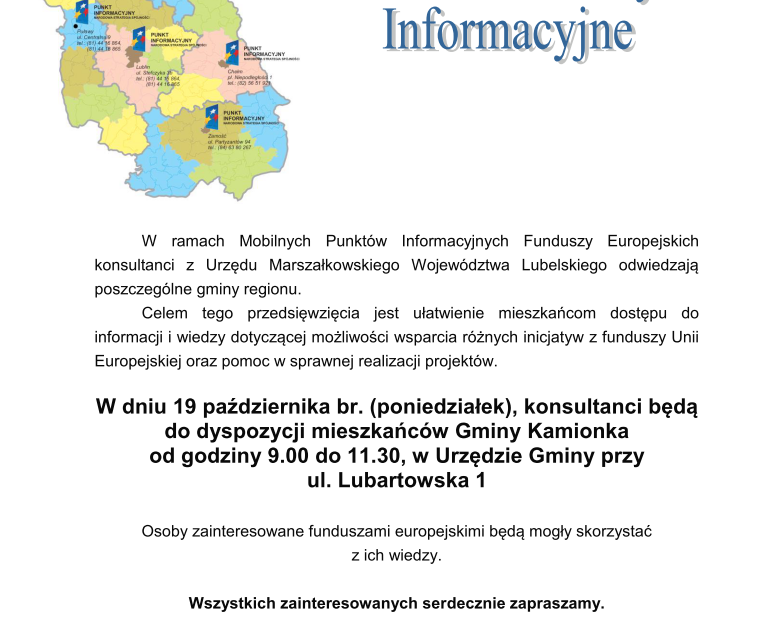 Będą dostępni w Urzędzie Gminy od 9 do 11.30. Można będzie od nich uzyskać wiedzę na temat wsparcia różnych inicjatyw ze środków Unii Europejskiej. Wizyty konsultantów w różnych gminach odbywają się w ramach Mobilnych Punktów Informacyjnych.