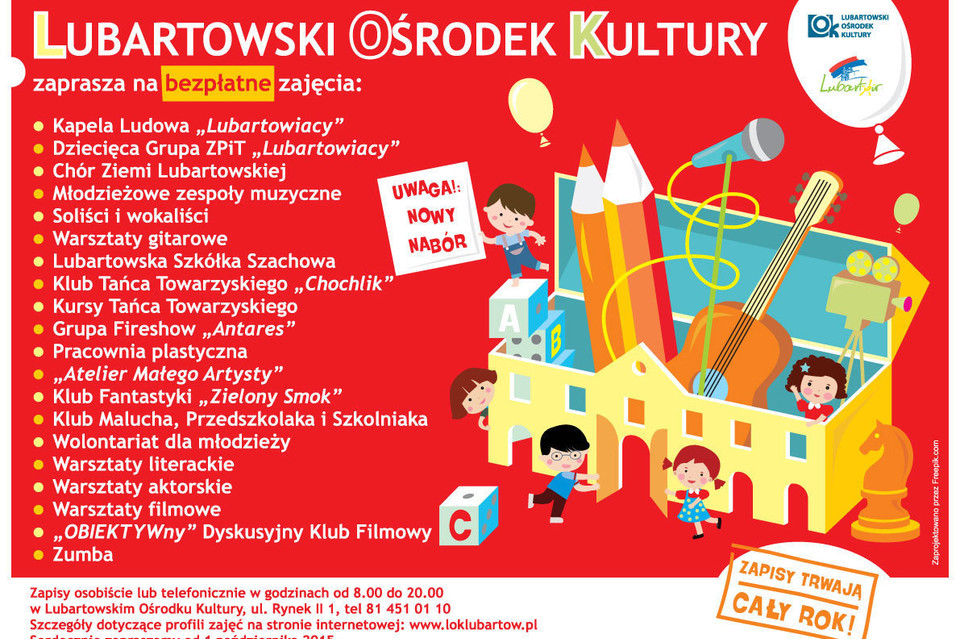 KulturaLubartowski Ośrodek Kultury ogłosił nabór na zajęcia. Zapisywać się można od 1 października. Zajęcia są bezpłatne.