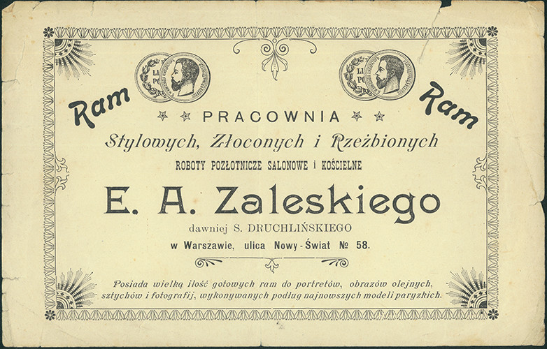 Eliasz Adam Zaleski urodził się w 1855 lub 1854 roku. Jego rodzicami byli Franciszek i Marianna z Fijałkowskich. Rodzina była na tyle majętna, że przyszły fabrykant ram mógł studiować w Paryżu na Akademii Sztuk Pięknych, nie wiadomo jednakże w jakiej pracowni i u jakiego mistrza szkolił swój talent. Po powrocie pracował w Fabryce Ram Szczepana Jana Druchlińskiego, a po jego śmierci w 1883 roku przejął zakład, jako wieloletni współpracownik poprzedniego właściciela. W marcu (kwietniu) tego roku zamieścił w „Kurjerze Warszawskim” ogłoszenie o przejęciu firmy, zapewniając klientów: „Wszelkie roboty wykonywać będę z tą samą akuratnością artystyczną, sztuką i gustem (…). Mam nadzieję, że JWW. Państwo raczą zaszczycać mnie tem samem zaufaniem, co mego poprzednika i powierzać raczą roboty”. Fabryka, wykonująca ramy do obrazów, luster, miniatur, grafik, fotografii, meble rzeźbione i złocone oraz wszelkie prace pozłotnicze, „salonowe i kościelne”, mieściła się na ulicy Krakowskie Przedmieście nr 2, w tzw. pałacu Karasia. Być może mieścił się tam jedynie sklep, zaś sama produkcja odbywała się gdzie indziej. Później firma zmieniła adres na Nowy Świat 58 (nalepki firmowe z nowym adresem są ozdobione medalem z podobizną cara Mikołaja II, panującego od 1894 roku, na wcześniejszych widnieje car Aleksander III).