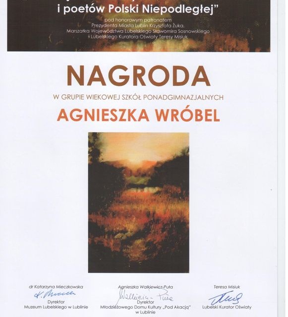 Niesamowite jest, że w XVII Ogólnopolskim Konkursie Plastycznym "Ilustracje do poezji Józefa Czechowicza i poetów Polski Niepodległej", którego finał został połączony z Koncertem Laureatów, Agnieszka Wróbel z klasy IIIa również zdobyła nagrodę. Jej wygrana nie dziwi, kiedy patrzy się na obraz, który stworzyła inspirując się fragmentami ,,Strof o późnym lecie" J. Tuwima. Po raz drugi jej praca znalazła się na okładce katalogu wystawy konkursowej, ponieważ,, była najpiękniejsza"- tak usłyszeliśmy od organizatorów. Należy podkreślić, że na konkurs wpłynęło 420 prac z sześciu województw. Opiekunem Agnieszki jest p. Beata Cieślak. Ale to jeszcze nie koniec wspaniałych wiadomości, ponieważ Wyróżnienie w tym konkursie otrzymała również Wiktora Falkowicz z klasy I c za piękny obraz inspirowany utworem Czechowicza "Śmierć". Uczennica pracowała pod kierunkiem p. Karoliny Oleksiejuk.