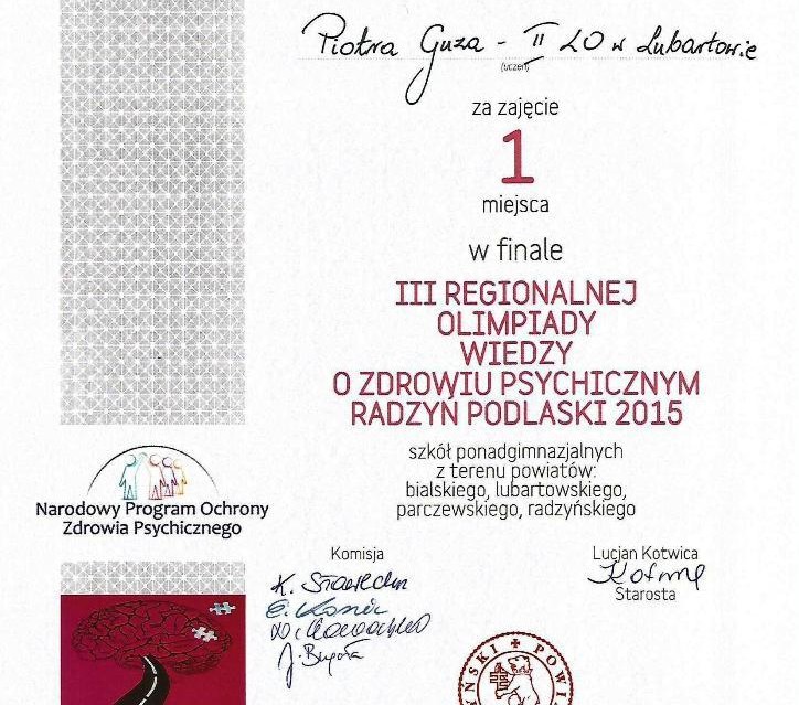 Finał Olimpiady został przeprowadzony 12 października w Radzyniu Podlaskim. Do udziału w konkursie przystąpiło 12 laureatów etapów powiatowych z powiatów radzyńskiego, parczewskiego, bialskiego i lubartowskiego. Uczeń II LO uzyskał najwyższy wynik – 23 punkty i zwyciężył, otrzymując cenne nagrody rzeczowe. Piotr Guz pracował pod opieką szkolnego psychologa - Anny Suchodolskiej.