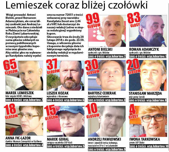 Aby oddać głos na wybranego Kandydata należy wysłać sms na numer 72051 o treści wskazanej przy nazwisku Kandydata (koszt sms 2,46 zł z VAT) lub dostarczyć do naszej redakcji (adres w stopce redakcyjnej) wypełniony kupon.