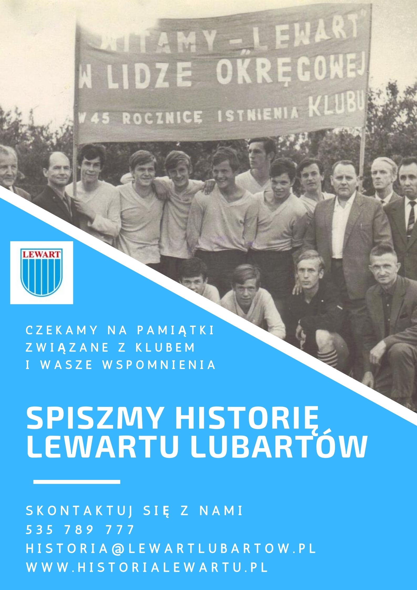Zbliżające się stulecie MKS Lewart Lubartów sprawia, że coraz bardziej poszukiwane są pamiątki z dawnych lat. Wspólnymi siłami portalu HistoriaLewartu.pl oraz lubartowskich mediów – Tygodnik Lubartowiak, Wspólnota Lubartowska oraz Lubartow24.pl postanawiamy rozszerzyć te poszukiwania I dotrzeć do szerszego grona odbiorców.