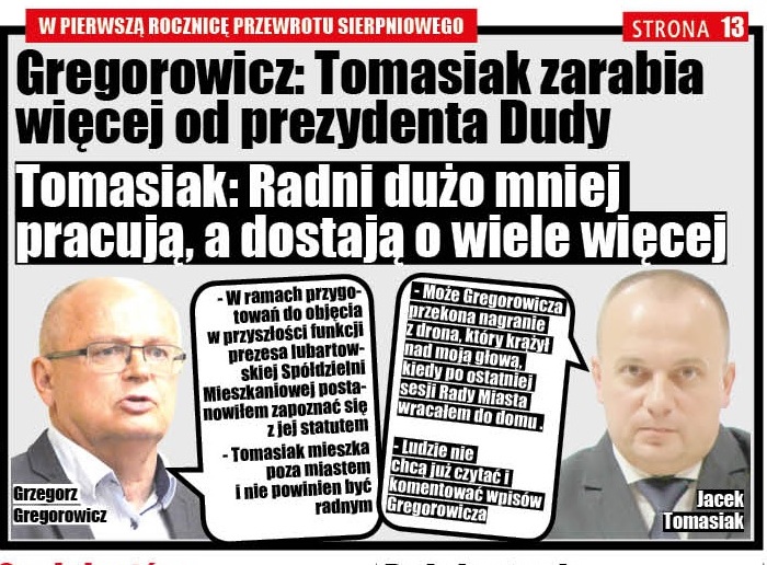 Rok temu, w sierpniu 2019 r. Rada Miasta podjęła uchwałę w sprawie podwyższenia wysokości diet radnych. Wzrosły one nawet dwukrotnie. Zwolennicy podwyżek argumentowali, że chcą urealnić diety i dostosować je do poziomu porównywalnego z innymi gminami. Przeciwnikiem zwiększania wysokości diet był ówczesny przewodniczący rady Jacek Tomasiak. Ostro skrytykował innych radnych w telewizji Kanał S. Widzowie przecierali oczy ze zdumienia, bo zaatakował kolegów z klubu Wspólny Lubartów, którego był liderem. I z którego wywodził się burmistrz Krzysztof Paśnik.W rezultacie przewodniczący, mimo że pół roku wcześniej wygrał wybory, stracił stanowisko i wpływ na to, co dzieje się w Lubartowie. Zastąpił go Grzegorz Gregorowicz, dotąd numer dwa we Wspólnym Lubartowie.Obydwaj przypomnieli te lubartowskie "wydarzenia sierpniowe" - Tomasiak w spółdzielczej telewizji, Gregorowicz na Facebook`u. Obaj doszukują się analogii między polityką w wydaniu lubartowskim a polityką krajową. Tomasiak porównuje głosowanie za podwyżkami dla miejskich radnych z głosowaniem w sprawie podwyżek dla posłów. Punktem odniesienia dla Gregorowicza są zarobki prezydenta RP - niższe niż prezesa Spółdzielni Mieszkaniowej, którym jest Tomasiak.