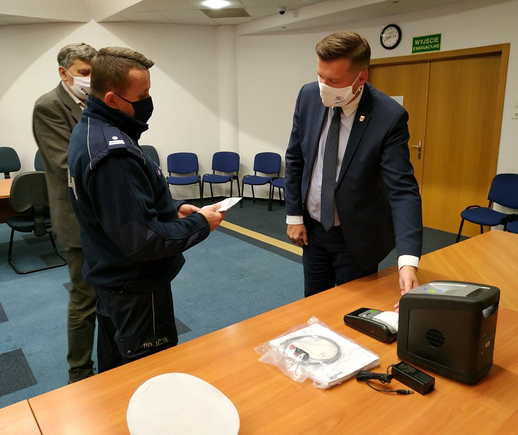 Opis: Wręczenie narkotestu w Urzędzie Miasta. Od lewej Waldemar Kijek, podinspektor Marek Bocian, burmistrz Krzysztof Paśnik