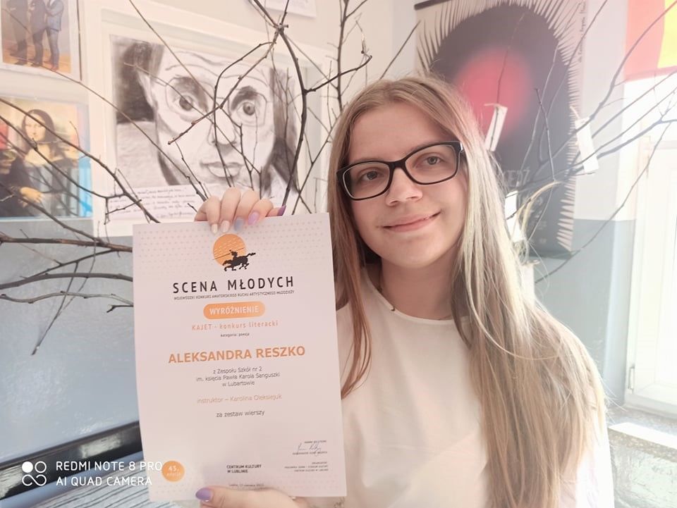 Poetae nascuntur. Poetą się rodzisz - mówi łacińska sentencja. Jeśli to prawda, to mamy w naszym gronie „urodzoną poetkę”. Jest nią uczennica I LO w Lubartowie Aleksandra Reszko (II d), która została wyróżniona w tegorocznym Wojewódzkim Konkursie Amatorskiego Ruchu Artystycznego Młodzieży „Kajet”. Podczas warsztatów poetyckich towarzyszących konkursowi Ola dowiedziała się, iż ma wielki talent do budowania poetyckich obrazów – sugestywnych, zmysłowych, intymnych. Czy potrzeba lepszej zachęty, aby tworzyć wiersze?