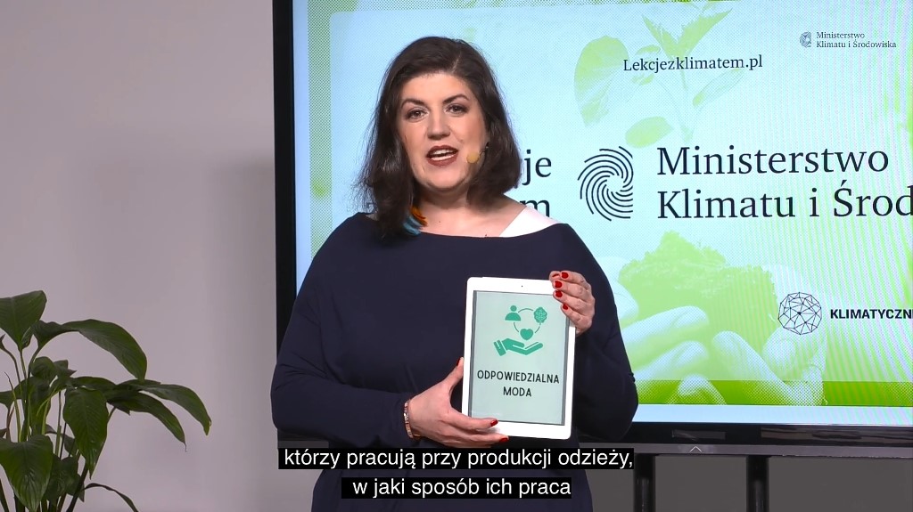Po wykładach młodzież wzięła udział w warsztatach kulinarnych zorganizowanych przez panią Jagnę Niedzielską, która zapoznała słuchaczy z ideą ekologii kulinarnej i zwróciła uwagę na problem marnowania żywności. Ostanie zajęcia prowadzone w ramach „Lekcji z klimatem” miały charakter warsztatowy i dotyczyły zagadnienia „Zrównoważonej mody”. Poprowadziła je pani Katarzyna Wolszczak, która uzmysłowiła młodym ludziom, jak ważne dla ochrony środowiska jest odpowiedzialne kupowanie odzieży. Wykład o wpływie mody na klimat i środowisko, o prawach pracowniczych, a także o szkodliwych substancjach, które znajdują się w naszych ubraniach z pewnością zaowocuje świadomymi decyzjami podczas kolejnych zakupów. Na zakończenie wirtualnego spotkania młodzież mogła wziąć udział w quizie przygotowanym przez organizatorów.