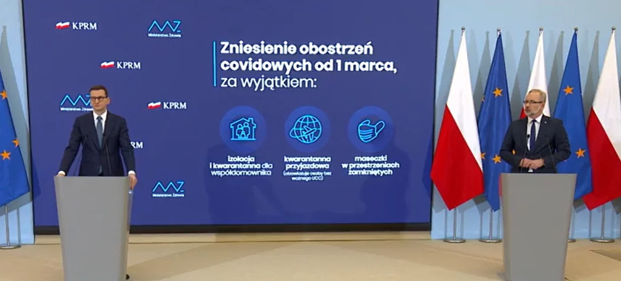 Autor: Screen - Kancelaria Premiera/Facebook | Opis: Konferencja prasowa premiera i ministra zdrowia w sprawie znoszenia obostrzeń